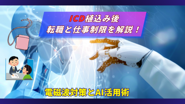 AIを仕事に活用 ICD植込み後の転職と仕事制限を解説!電磁波対策とAI活用 心臓手術でICD(植込み型除細動器)を装着した後、仕事に不安を感じる方もおられるでしょう。しかし新しいキャリア構築という道もあります。本記事では、日常生活や仕事での注意点に加え、AIを活用した新しい働き方についても解説します。 2026.04.17 AIを仕事に活用リスキリング